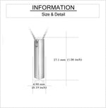 The Eternity Keepsake Urn Locket Pendant Necklace is a versatile memorial jewelry piece designed to hold ashes, perfume, crushed flowers, dirt, hair, sand, or notepaper. The urn screws open from the bottom for easy filling and can be personalized with engraved text on the back. Made from hypoallergenic sterling silver, it is nickel-free, rust-proof, and corrosion-resistant. The pendant measures 27.1 mm by 4.9 mm (1.06 x 0.19 inches) and comes with a 1.2 mm rolo chain and an 18+2-inch extender for adjustable length (18-20 inches).