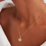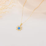 The sun symbolizes passion, happiness, and warmth, radiating strong power. This dainty sun pendant features a 6mm round blue opal, maximizing brilliance while maintaining excellent cut. Embellished with moissanite, it adds glamour to any outfit....
