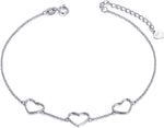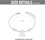This women's gold bracelet is crafted from 58.5% pure 14k real gold, not just a covering, ensuring high quality and nickel-free materials. The design features three heart-shaped pendants on a dainty gold chain, creating a thin and simple anklet that symbolizes love between you and her. The bracelet measures 8.45 inches with a 1.55-inch adjustable extender, totaling 10 inches in length, with hearts sized 6.5 mm and 8.5 mm, and weighs 1.2 grams.