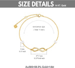 This women's gold ankle bracelet is crafted from high-quality 14k real gold, containing 58.5% pure gold, not just gold-plated. The nickel-free design features a delicate infinity shape adorned with white diamonds and freshwater cultured pearls. Diamonds measure 1.1-1.3 mm with SI2-I1 clarity and I-J color, totaling 0.11 ct. The infinity motif is 7.5 mm wide and 17 mm long, complemented by 4 mm pearls. The bracelet length is 9.4 inches with a total length of 11 inches.
